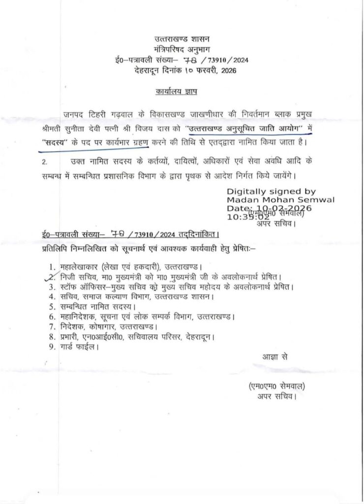 नई टिहरी (शीशपाल रावत): टिहरी जिले की राजनीति में एक बार फिर जाखनीधार का नाम चर्चा में है। जाखनीधार की निवर्तमान ब्लॉक प्रमुख सुनीता देवी को उत्तराखंड अनुसूचित जाति आयोग में सदस्य की महत्वपूर्ण जिम्मेदारी सौंपी गई है। धामी सरकार द्वारा विभिन्न दायित्वों का वितरण शुरू होते ही यह नियुक्ति क्षेत्र के लिए गर्व का विषय बन गई है। शासन स्तर से इसके विधिवत आदेश भी जारी हो चुके हैं।